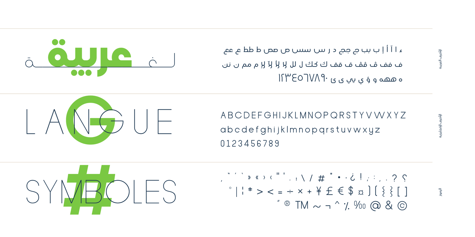 AS NOQTA Its structure is equal and visually controlled. Character forms are a combination of vertical straight lines that integrate visually with soft angles in some areas. This makes it a line of nature suitable for today’s technological and visual development. The variations and weights of this font are suitable to use companies in their names and appearance, and also suitable with the titles and logos and is also used in all the requirements of advertising and long texts, use in headlines, logotypes, branding, books, magazines, motion graphics, web and Tv.